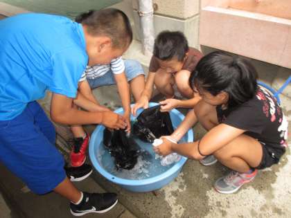 18日の5校時,その日に着ていたTシャツを手洗いしました。グループごとに,たらいに水を入れ,洗剤の量を確認して入れ,もみ洗いをしました。水を流しては入れて・・・を繰り返しきれいにすすいでいると,「昔は大変やったんやなあ。」と,子どもたちのつぶやきが聞こえてきました。ハンガーに干したTシャツは,気持ちよさそうに揺れていました。6年ルームでかわかし,19日持ち帰ります。