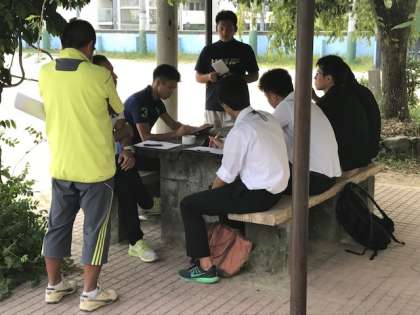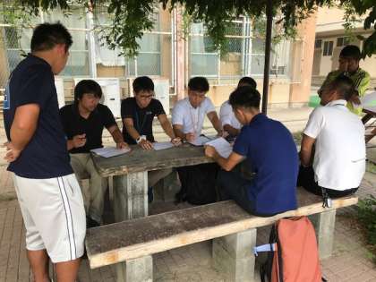 グラウンドでの授業を終えて,早速その場で本日の授業についての意見交換が交わされていました!