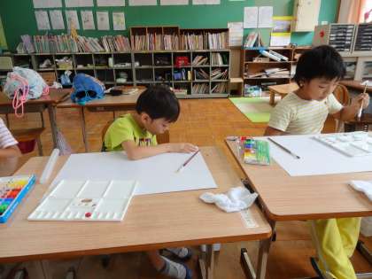 初めて絵の具セットを使った学習をしました。まずは,用具の説明から「パレット」や「筆洗」などを見て「どうやって使うんだろう?」と考えながら学習しました。準備ができたらいよいよ絵の具を使って色を塗ります!赤や青を使って丸や線を描きました。