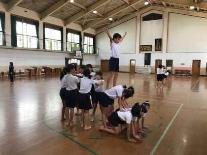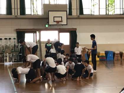 1時間目6年生が体育館で組体操の練習。