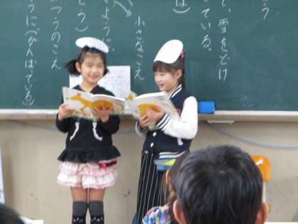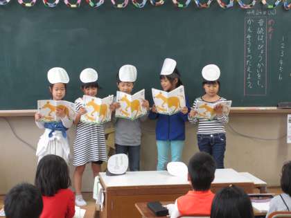 4月,「ふきのとう」の音読発表会をしました。お面をかぶり,役になりきって音読をすることができました。