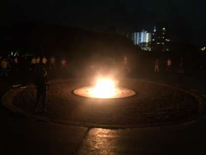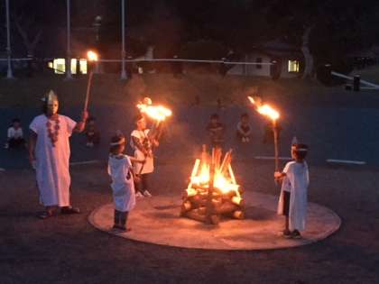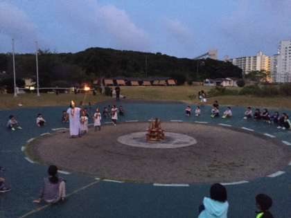 夕食後は屋外の営火場での「キャンプファイアー」です。