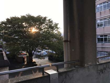 週末金曜日,今朝も写真でお分かりのように,木々の隙間から朝日が差込み,気持ちの良い青空が広がろうとしています。