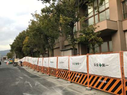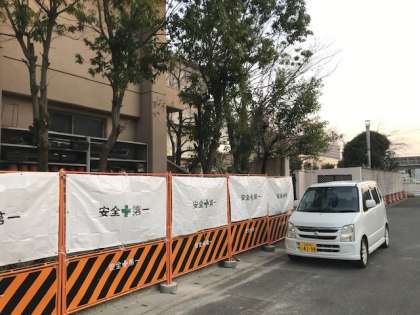 裏門(西門)の体育館側ブロック塀はあっという間に撤去され,フェンスの設置工事までは,代替フェンスで覆われています。