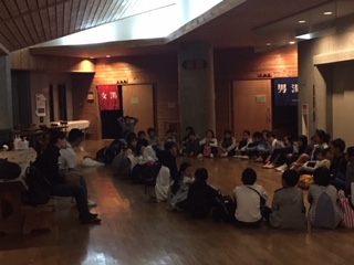 オリエンテーションホールは違う学校が先に使っているので,お風呂場前で静か〜にミニゲーム。