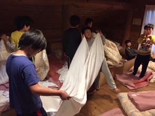 最終日の朝です。みんなおきられるか心配でしたが,6時に起きて布団の始末をしていました。協力して部屋を片付けます。