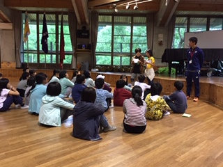 最終日の朝の集いです。この日のゲームは「ステレオゲーム」です。