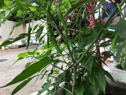 写真は,ワンダフルワールドの緑のカーテンに咲く「ゴーヤの実」と校門前プランターに植えられている「トウガラシの実」の様子です。