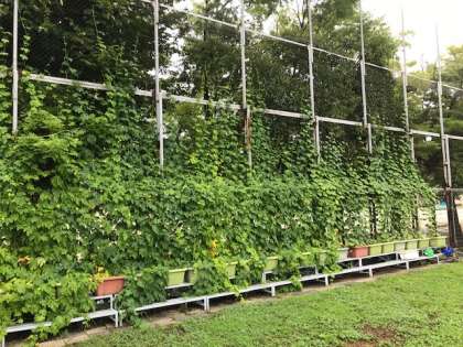 写真は以前にも掲載しましたが,6月に環境美化委員会がプランターに植えて栽培してきたゴーヤと西洋アサガオによる「緑のカーテン」の様子です。例年以上に生育が良く,1枚1枚の葉っぱも濃い緑色で立派に大きく広がっています。