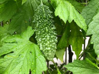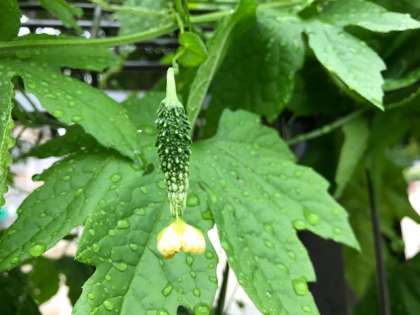 その大きな葉っぱに隠れて見つけにくいのですが,ゴーヤの実もすくすくと大きく成長しています!