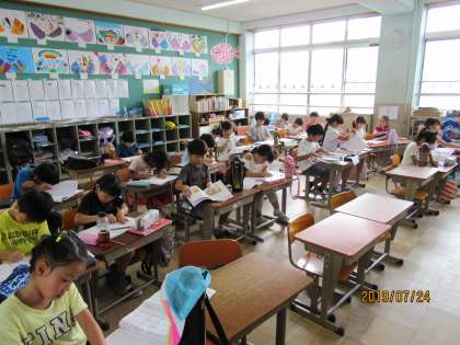 夏休み初日の「サマースクール」です。たくさんの子どもたちが元気に登校し,涼しい教室で宿題に取り組みました。