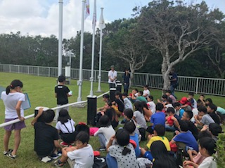 作った旗を揚げながら元気一日に校歌を歌っています!
