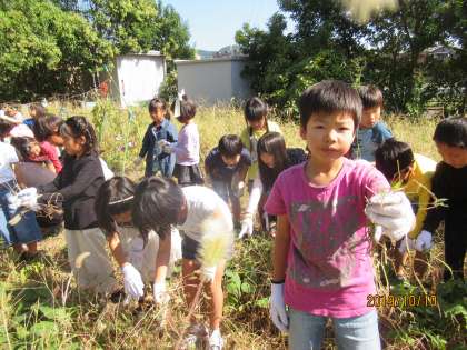 2年生が育てているさつまいもの畑の雑草を,みんなで力を合わせて抜きました。抜いた草は,大きなビニール袋4つ分にもなり,すっきりした土の中から,紫色のおいもが顔を出しているのが見えました。