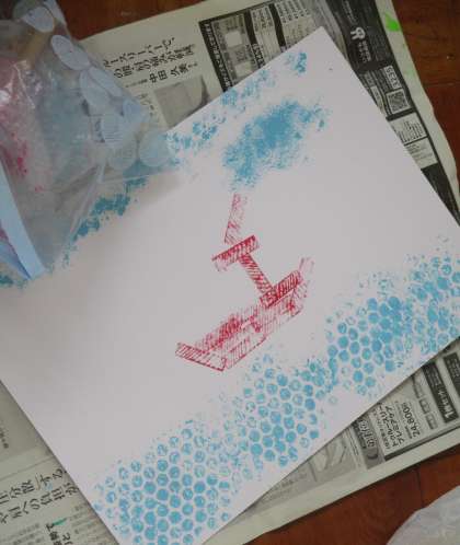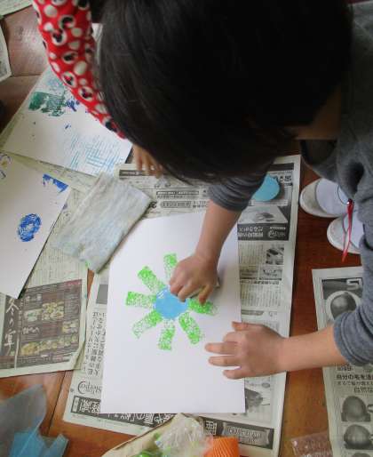 図工の時間に「うつした かたちから」の学習をしました。カップ,野菜の切れ端などを使ってペタペタかたちを写していきました。