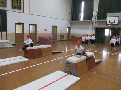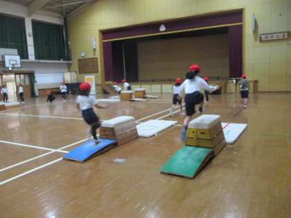 体育では「とびばこ遊び」に取り組んでいます。いろいろな場に挑戦し,たくさん体を動かしています。手でぐっと押したり,跳んだり,跳び箱を飛び越えるために必要な日からを身に着けていっています。