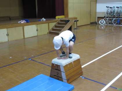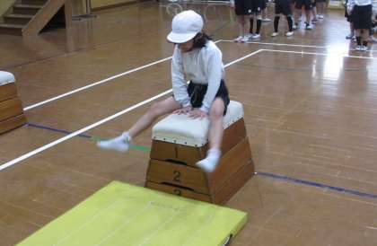 新しい技,跳び上がり・跳び下り,またぎ乗り・またぎ下りです。この技から開脚跳びにつなげていきます。