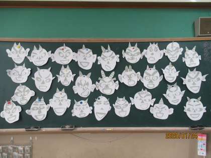 図工『たのしく うつして』の学習で,がんばって作っていた「鬼の顔」がついに完成しました。同じ材料を使っているのに,いろいろな表情をした鬼が出来上がるのが面白いですね。