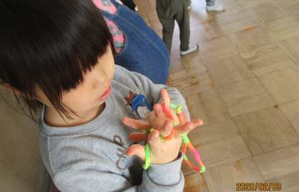 生活科の学習で,むかしあそびの練習をしました。コマは回せるようになった子がふえてきました。けん玉も初めてできたという子もいました。初めてあやとりの練習もしました。