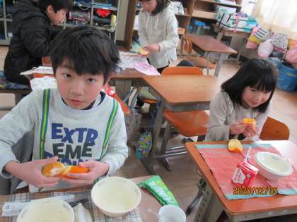 今日の給食に「伊予柑」が出ました。食べなれていないためか,皮をむくのに悪戦苦闘していましたが,果汁たっぷりの旬の味を美味しくいただきました!