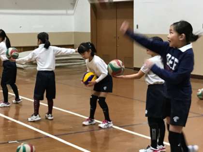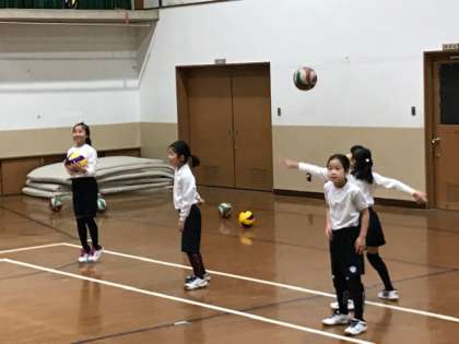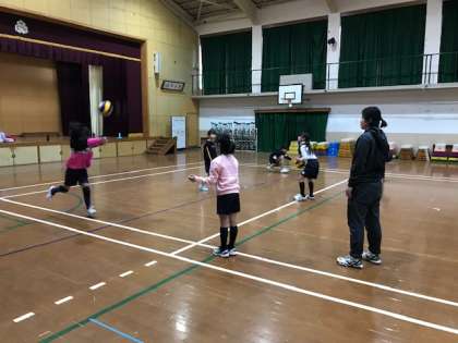 ボール練習でさらに身体を動かし,ゲーム練習ではコート内での約束事や週末の試合を想定して,点数が入ったら全員で喜び,仲間がミスをしたらお互いに励まし合うことの反復練習をしました。