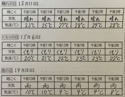 上から1まい目の写真は,「晴れ」「くもり」「あめ」の日の気温の変化についての表をのせています。気温を温度計,インターネット,新聞などで調べることができない人は参考にしてくださいね。