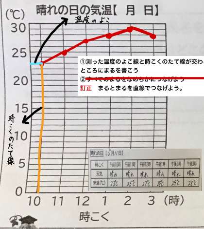 2まい目の写真は,5月11日の気温の変化を折れ線グラフに表したものです。気温の変化についての表が書けた人は,折れ線グラフも書いてみましょうね。