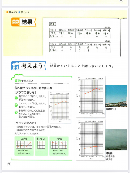 3まい目の写真は,教科書p12です。折れ線グラフの表し方や読み方,天気による気温の変化についてヒントがのっています。ぜひ見ながら,取り組みましょう。