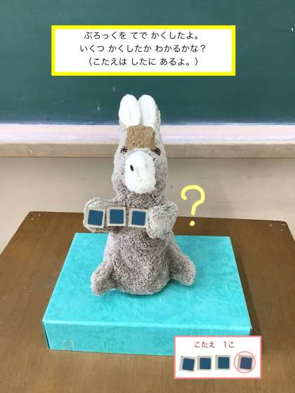ろばさんの てに かくれている ぶろっくの かずを かんがえましょう。