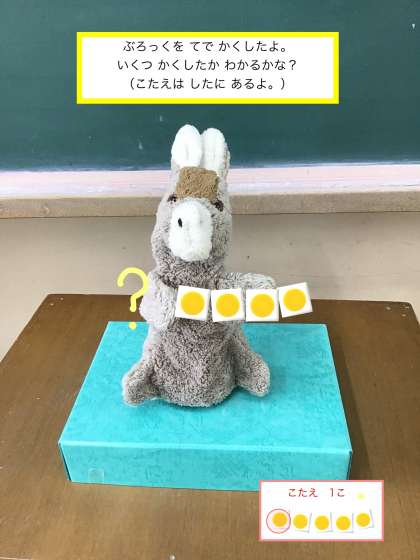 ろばさんの てに かくれている ぶろっくの かずが わかるかな?
