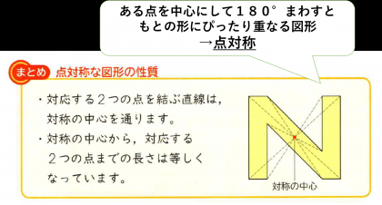 ある点を中心にして180°まわすと,もとの形にぴったり重なる図形を「点対称な図形」といいます。画像のように,くるっと回すとわかりますね。