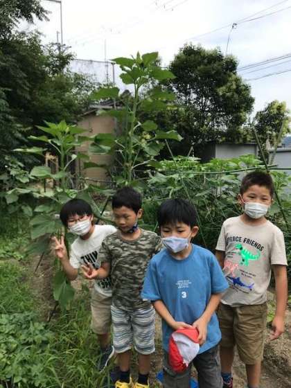 どうやら,昨年咲いていたヒマワリの種が土の中に埋まっていたようで,更に,春先,おやじの会の方々が土を耕し,肥料を十分に混ぜて下さったので,土壌は栄養満点の状態です!