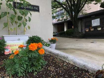 校門前のプランターも梅雨明けに訪れる真夏の暑さにも耐えれる「マリーゴールド」に植え替えました。
