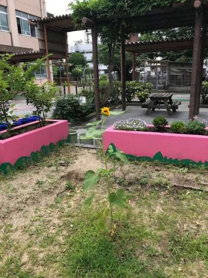 と言ってもプランターや花壇に咲いているのではなく,何と!向日葵は中庭の砂場で,