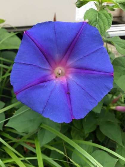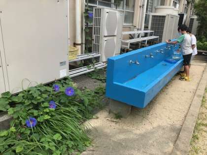朝顔は北校舎沿いの側溝からツルが伸びて花を咲かせています。