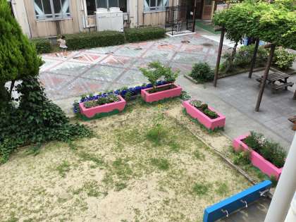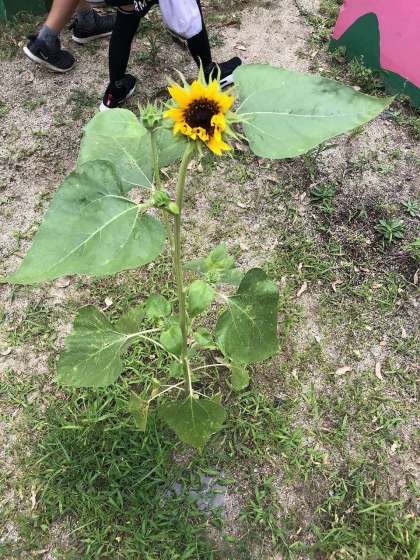 以前より窓から見える造形砂場になにやら大きな植物が…。子どもたちは毎日観察しているとヒマワリだとわかりました。「なぜ?」「だれが?」疑問は残りますが,ウキウキして観察していました。