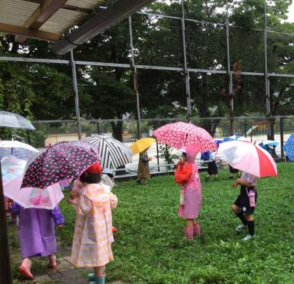梅雨真っ盛り。外で遊べず元気をもてあましている様子の1年生ですが,今日は,「雨の日の運動場の様子」を見に行きました。「こんなところに大きな水たまりができるんだ!」「雨の日のワンダフルワールドはカエルがいっぱいいそうだぞ。」などいろいろな発見ができました。