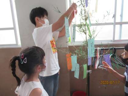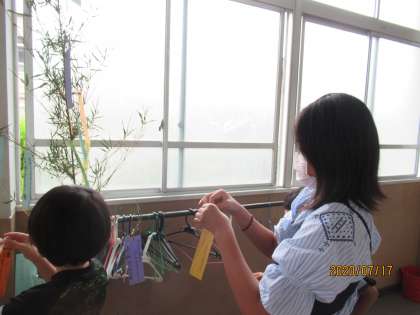 お願いを書いた短冊を,6年生のお兄さん,お姉さんに教室前の笹に付けてもらいました。