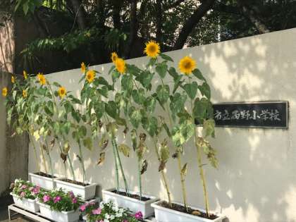先週の梅雨明けと共に,校門前のプランターは,「向日葵(ひまわり)」「マリーゴールド」が次々開花して,色とりどり大変賑やかに咲き誇っています。