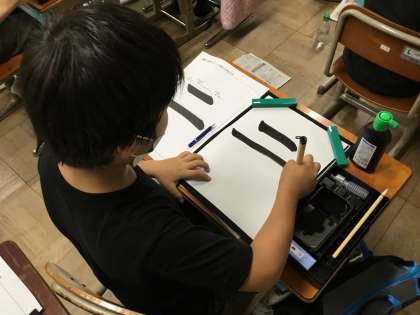 昨日は習字セットのつかい方。今日は実際に「二」を半紙に書きました。