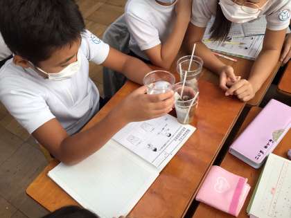 子どもたちは,地面にしみこむというだけでなく,粒が細かい砂のほうが,砂と砂の間が小さいので水が流れるのに時間がかかるということにも気づいていました。