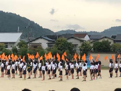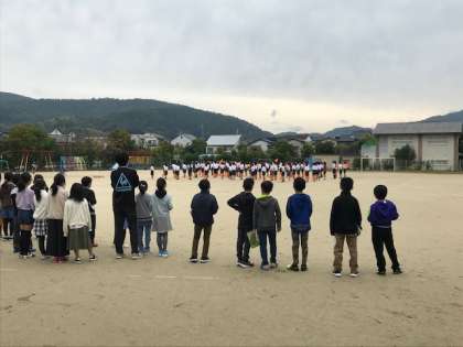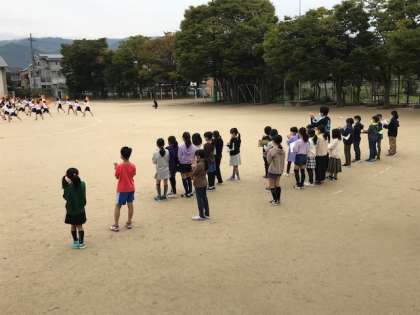 時折,雨がポツポツと降っている運動場で,5・6年生が集団演技の練習に励んでいます。立って見ていると肌寒いくらいの気温ですが,音楽に合わせようと必死に動いている5・6年生は元気そのものです!