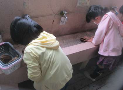 担当の掃除場所の手洗い場を一生懸命掃除している子たちを