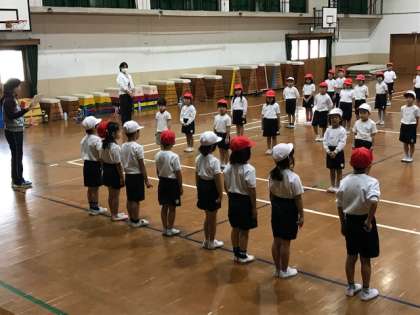 体育館では,1年生が開会式の練習でしょうか?タテ・ヨコきっちりと並んでいます。