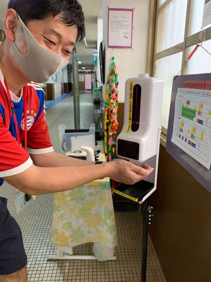 先日,「おやじの会」よりコロナウイルス感染拡大防止に活用して下さい!と,検温と手指消毒が一度に出来る優れモノを4台寄贈していただきました!