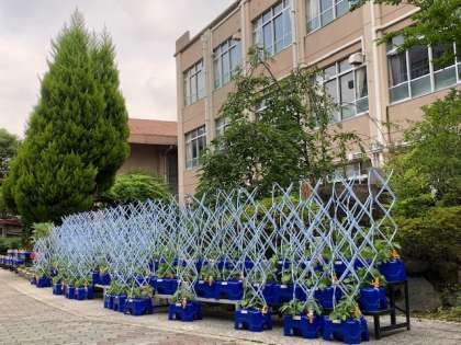 昨日から中庭におかれている1年生の「朝顔」の栽培プランターに囲いが取り付けられました。