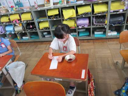 色水遊びで作った「しおり」を本日持ち帰っていますので,見てあげてください。
