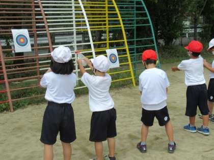 ケチャップやマヨネーズの空き容器を使って,水遊びをしました。「容器の穴が小さいほうがよくとぶよ。」「斜め上に向けて飛ばしても,水が曲がって落ちてきたよ。」など,いろいろな発見があった楽しい時間となりました。