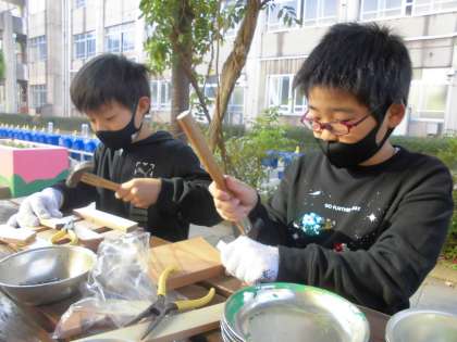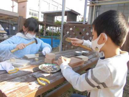 のこぎりで「ギコギコ」した後は,金づちやげんのうで「トントン」しています。切った木を組み合わせ,作品を仕上げていきます。どんな作品が完成するのか楽しみです。