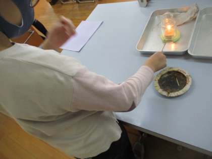 6年生の理科の実験の様子です。空気がどのように流れるのか,線香の煙をじっくり観察していました。