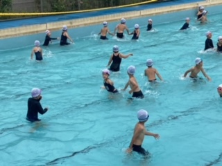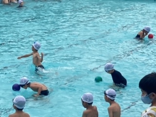 今週は先週よりも水量が増え,電車ごっこやボールリレーなどの遊びを通して水に慣れ親しんでいました。